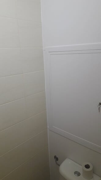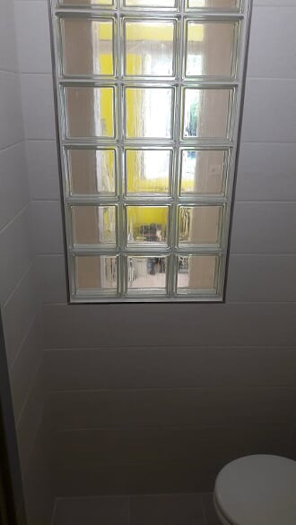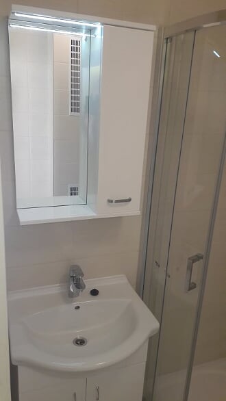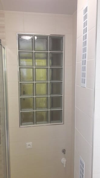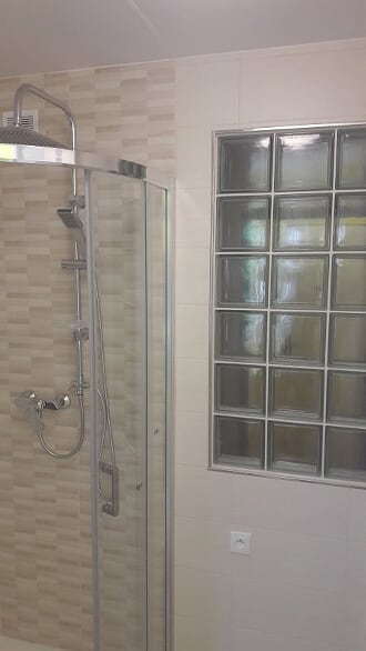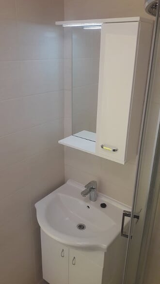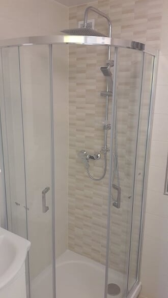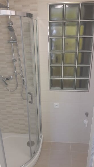 Obsah: oddělení koupelny a WC příčkou z luxferů, zakrytí topných trubek s výdechy, obklady stěn, podlaha, strop, rozvody vodoinstalací a elektro, sprchový kout s vaničkou z litého mramoru, sprchový set s dešťovou sprchou, umyvadlo se skříňkou a LED osvětlením, LED stropní osvětlení, zařizovací předměty
