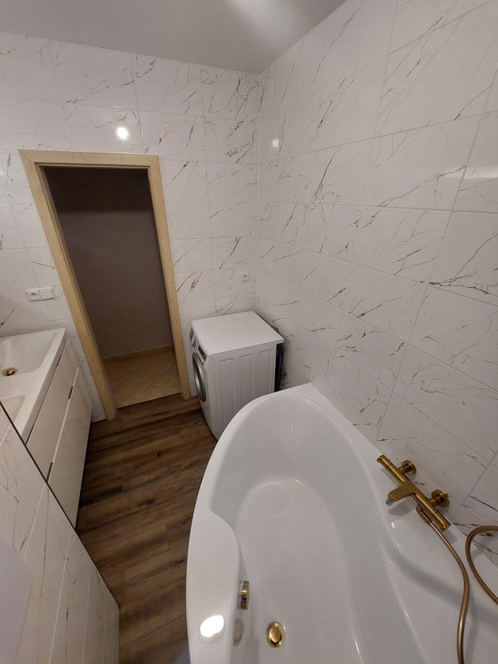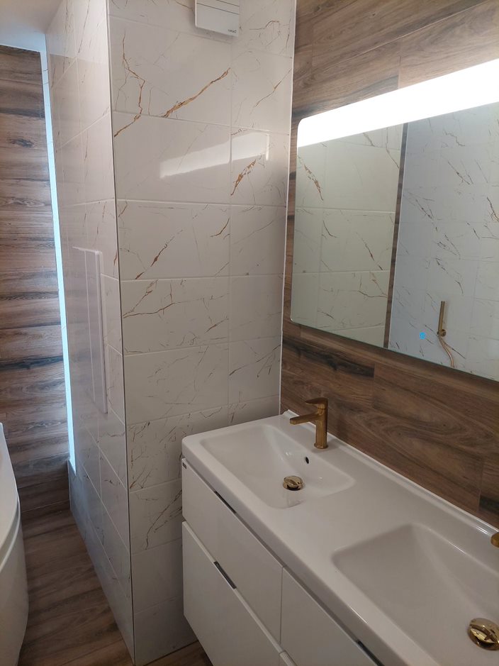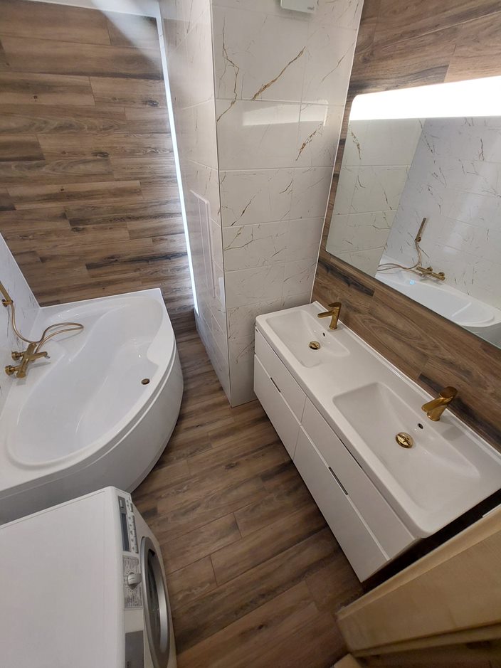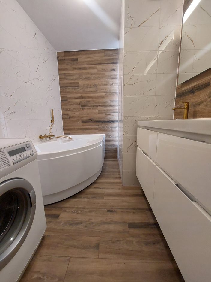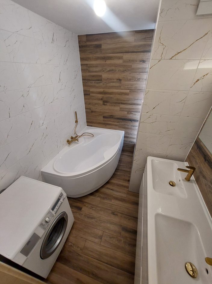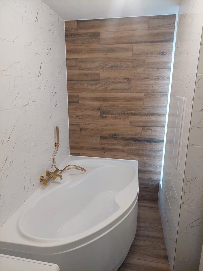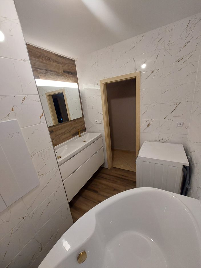 Obsah: odstranění původního obkladu a dlažby, obklady stěn, nivelace a dlažba, rozvody vodoinstalací a elektro, instalace rohové vany Ravak Rosa II vč.krycího panelu, baterie se sprchou, zrcadlo s LED podsvícením, LED podsvícení úložného prostoru se skleněnými policemi