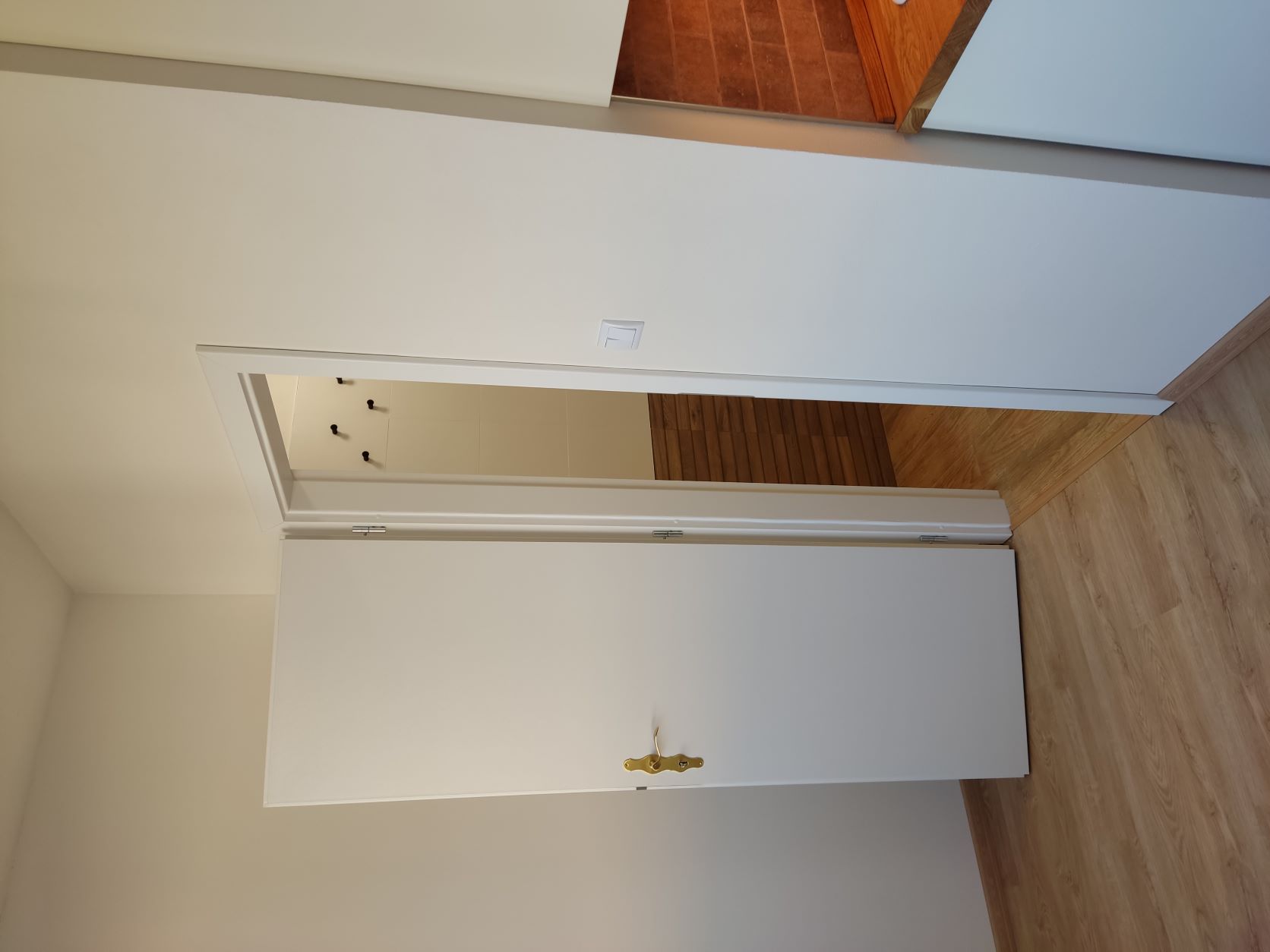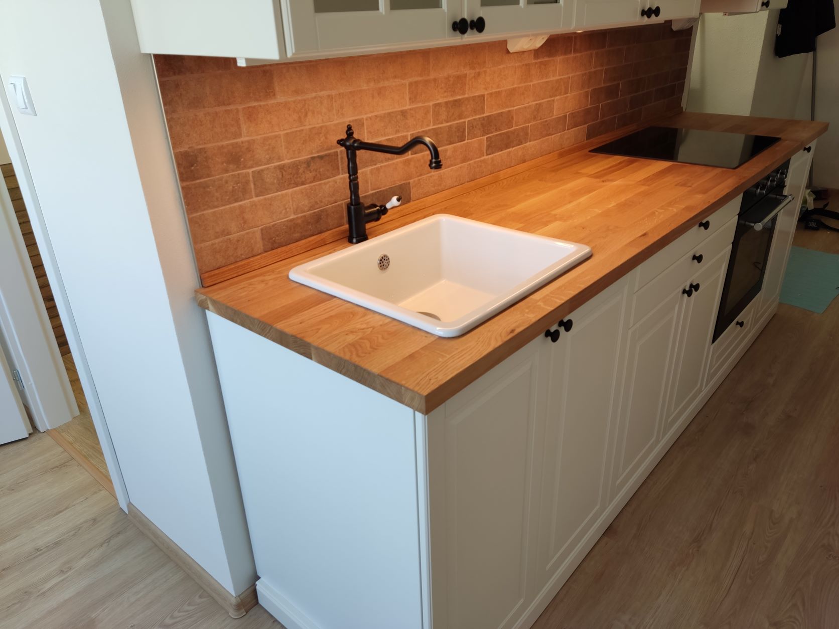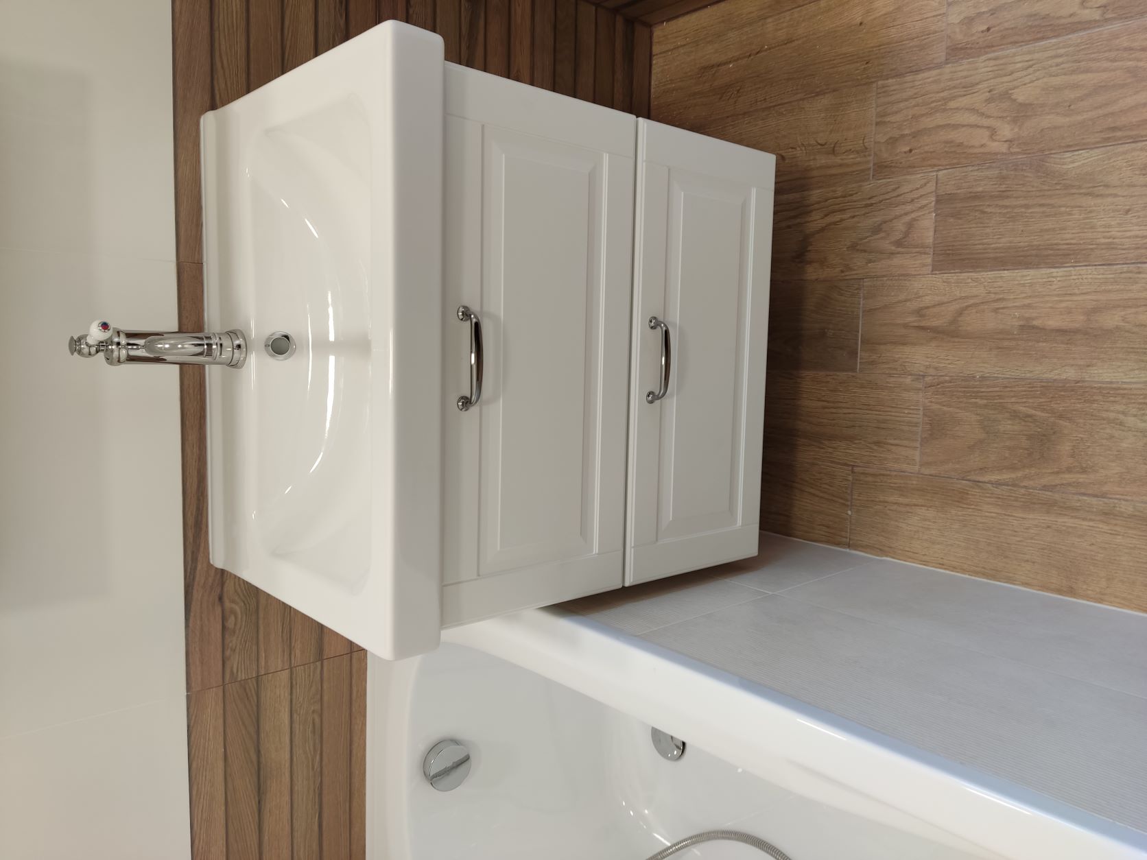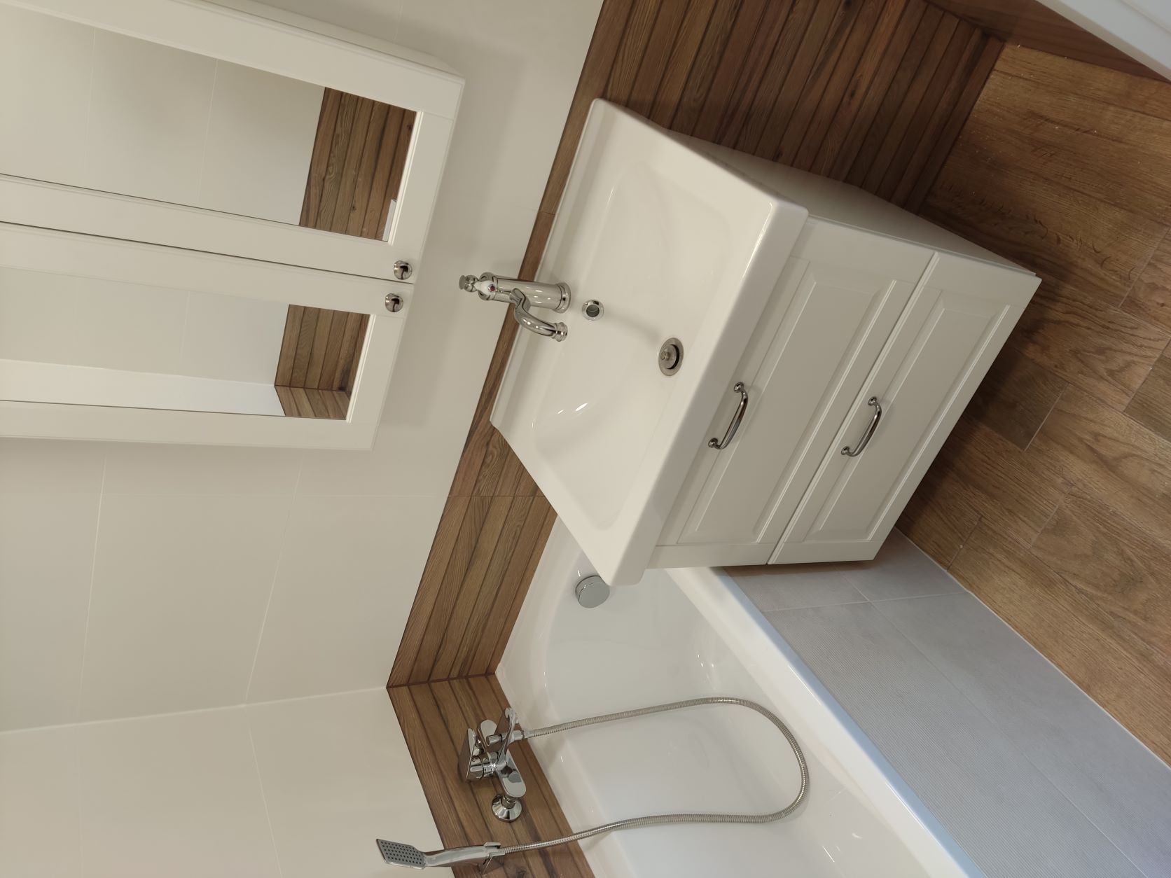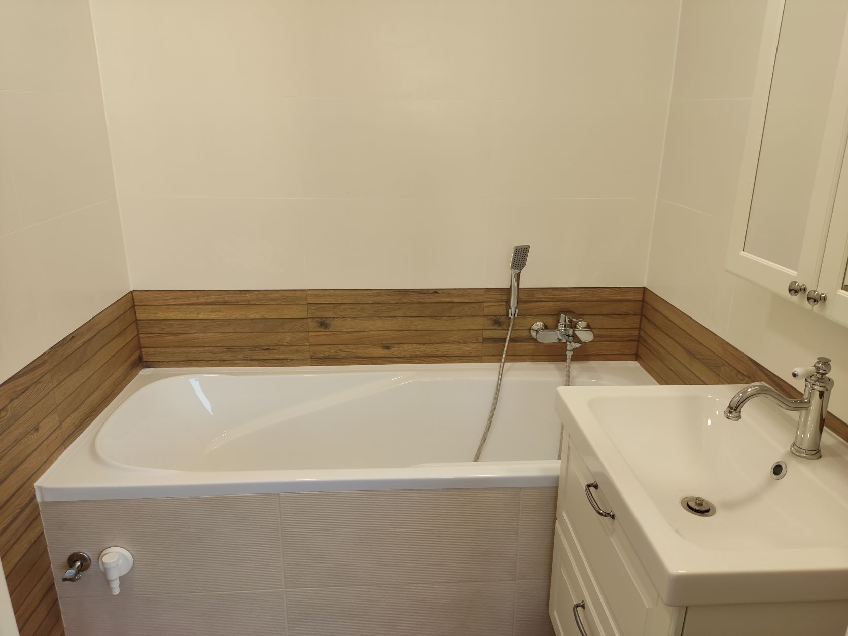Obsah: vybourání umakartového jádra, nové jádro z Ytong, obklady stěn, podlaha, strop, rozvody vodoinstalací a elektro, instalace vany 170x70 Ravak Vanda II, baterie se sprchou Lucida, umyvadlo se šuplíkovou skříňkou s baterií Lucida, zrcadlová galerie, WC kombi Vitra, rohové umývátko Bigio, kuchyňská linka Ikea, el. trouba, indukční varná deska, dřez s baterií, digestoř, instalace dveří s obložkovou zárubní, štukování stěn, vinylová podlaha